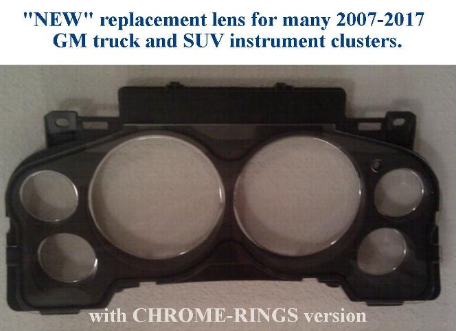2007—2013 G9C LENSES These are NEW OEM replacement instrument cluster lenses for many 2007-2013 GM truck and SUV vehicles. Don't buy used or salvaged when you can have this NEW replacement clear acrylic lens and black ABS bezel assembly. We have the G9Chrome-ring version available. The deluxe version has “CHROME-RINGS” around the gauges -- the other version is “ALL-BLACK” (without chrome-rings). Consider using a “CHROME-RING” lens on a cluster normally fitted with an All-Black lens as an “ENHANCEMENT / UPGRADE”! This lens meets OEM requirements inclusive of an Abrasion-resistant coating, and an optical-grade clear acrylic lens material (UV inhibited to prevent yellowing with age). The lens is bonded to the black ABS trim-bezel via the highest quality “full-perimeter vibratory-weld process” for strength and durability.