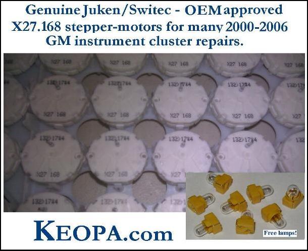 Genuine X27.168 Juken / Switec stepper-motors are OEM approved replacement motors for many GM instrument clusters from 2000 to 2006. The X27.168 replaces original C5.168, XC5.168, X15.168, or X25.168 previous revisions. |